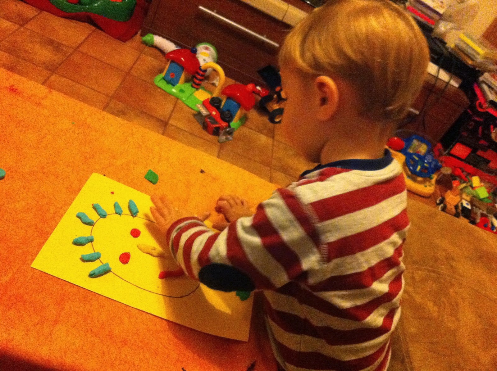 Ça y est, on a passé pas mal de temps à manipuler la pâte à modeler, chose primordiale quand on y pense! il ne faut pas se fixer des objectifs trop compliqués, un enfant reste un enfant et ce qu'il veut au départ c'est tripoter la matière, prendre le temps de la découvrir. Si en plus il y a plusieurs couleurs on prend encore plus de temps à vérifier qu'on peut faire la même chose, peu importe la couleur !